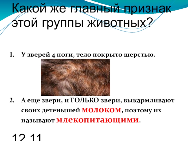 12.11.14Какой же главный признак этой группы животных?У зверей 4 ноги, тело покрыто шерстью.А еще звери, и ТОЛЬКО