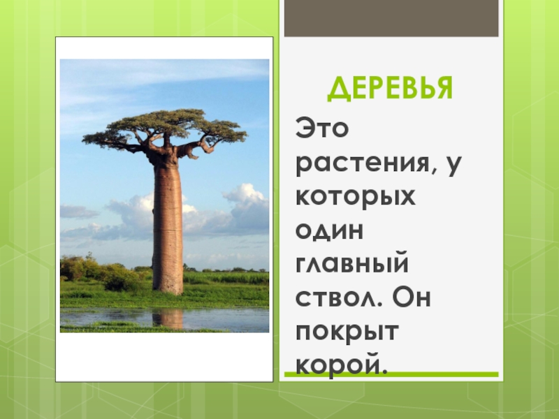 ДЕРЕВЬЯЭто растения, у которых один главный ствол. Он покрыт корой.