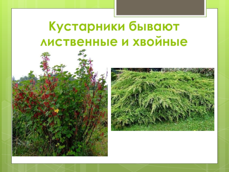 КУСТАРНИКИЭто растения, у которых нет одного главного ствола, а есть несколько. Но они обязательно покрыты корой.