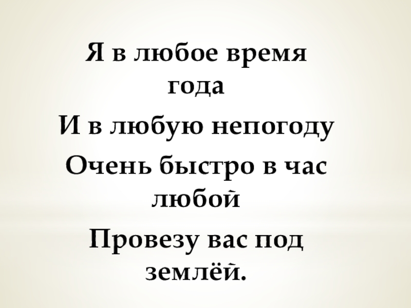 Я в любое время годаИ в любую непогодуОчень быстро в час любойПровезу вас под землёй.