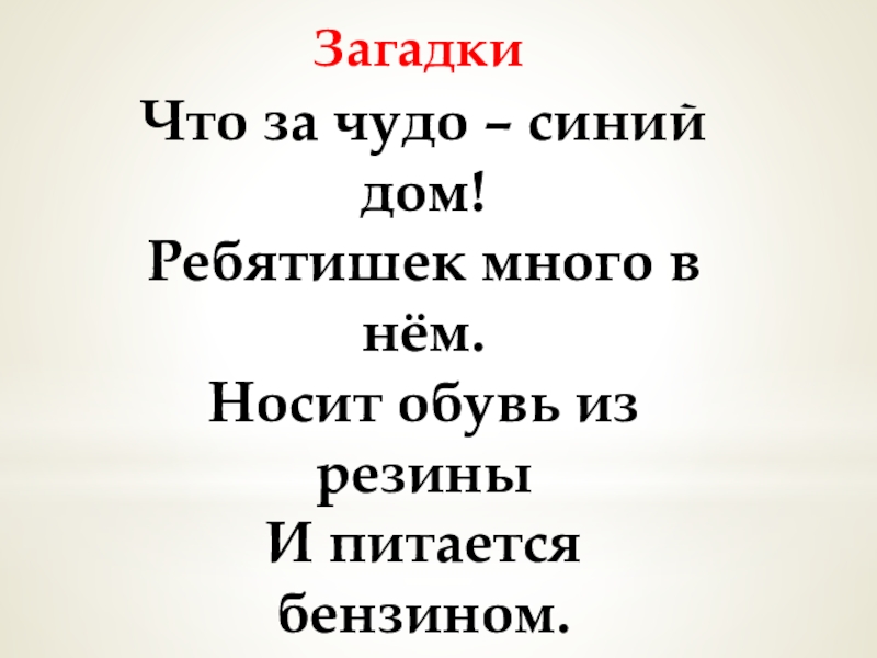 ЗагадкиЧто за чудо – синий дом!Ребятишек много в нём.Носит обувь из резины И питается бензином.