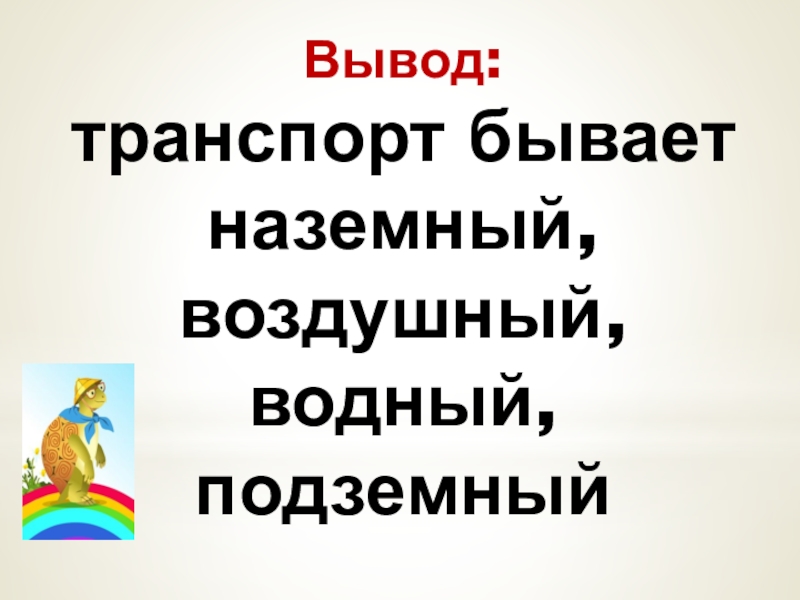 Слайд 20Вывод: транспорт бывает наземный, воздушный, водный, подземный