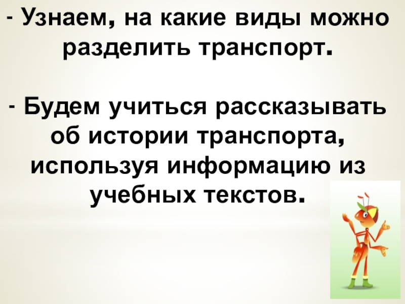 - Узнаем, на какие виды можно разделить транспорт. - Будем учиться рассказывать об истории транспорта, используя информацию из учебных текстов.