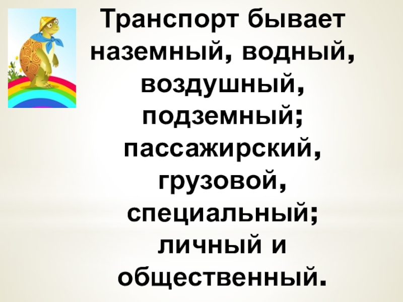 Слайд 36Транспорт бывает наземный, водный, воздушный, подземный; пассажирский, грузовой, специальный; личный и