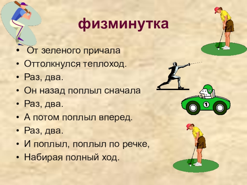 физминутка От зеленого причала Оттолкнулся теплоход.Раз, два.Он назад поплыл сначала Раз, два.А потом поплыл вперед.Раз, два.И поплыл,