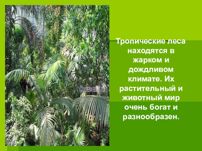 Слайд 3 Тропические леса находятся в жарком и дождливом климате. Их