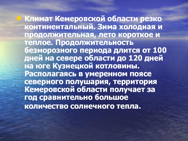 Слайд 2Климат Кемеровской области резко континентальный. Зима холодная и продолжительная, лето короткое