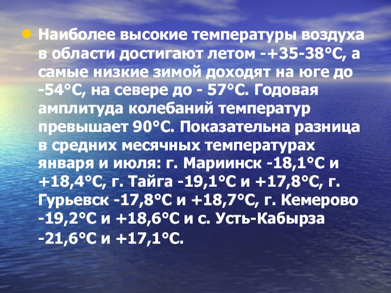 низкие зимой доходят на юге до -54°С, на севере до - 57°С. Годовая амплитуда колебаний температур превышает 90°С. Показательна разница в средних месячных температурах января и июля: г. Мариинск -18,1°С и +18,4°С, г. Тайга -19,1°С и +17,8°С, г. Гурьевск -17,8°С и +18,7°С, г. Кемерово -19,2°С и +18,6°С и с. Усть-Кабырза -21,6°С и +17,1°С.