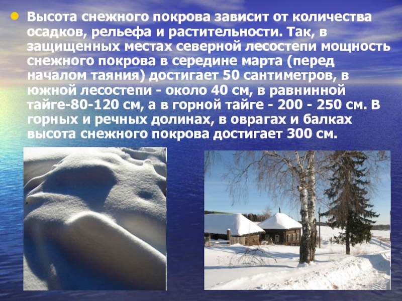 Слайд 10Высота снежного покрова зависит от количества осадков, рельефа и растительности. Так,