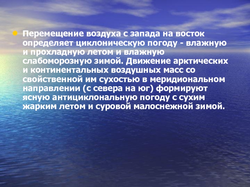 Слайд 5Перемещение воздуха с запада на восток определяет циклоническую погоду - влажную
