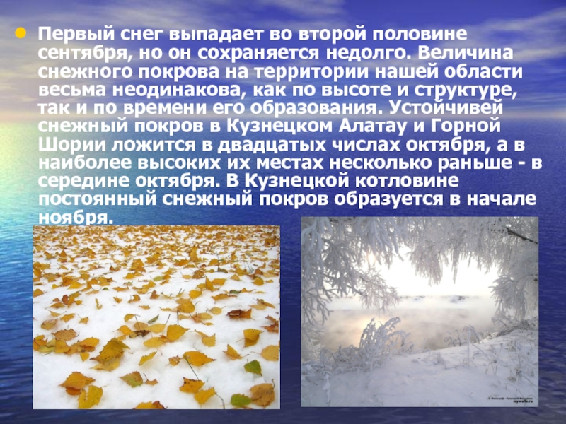Величина снежного покрова на территории нашей области весьма неодинакова, как по высоте и структуре, так и по времени его образования. Устойчивей снежный покров в Кузнецком Алатау и Горной Шории ложится в двадцатых числах октября, а в наиболее высоких их местах несколько раньше - в середине октября. В Кузнецкой котловине постоянный снежный покров образуется в начале ноября.