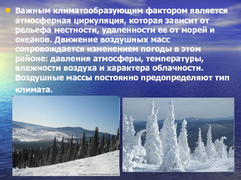 Слайд 4Важным климатообразующим фактором является атмосферная циркуляция, которая зависит от рельефа местности,