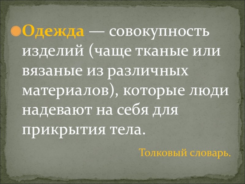 Слайд 3Одежда — совокупность изделий (чаще тканые или вязаные из различных материалов), которые