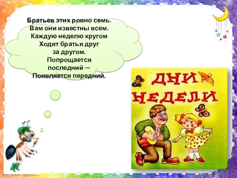 Братьев этих ровно семь. Вам они известны всем. Каждую неделю кругом Ходят братья друг