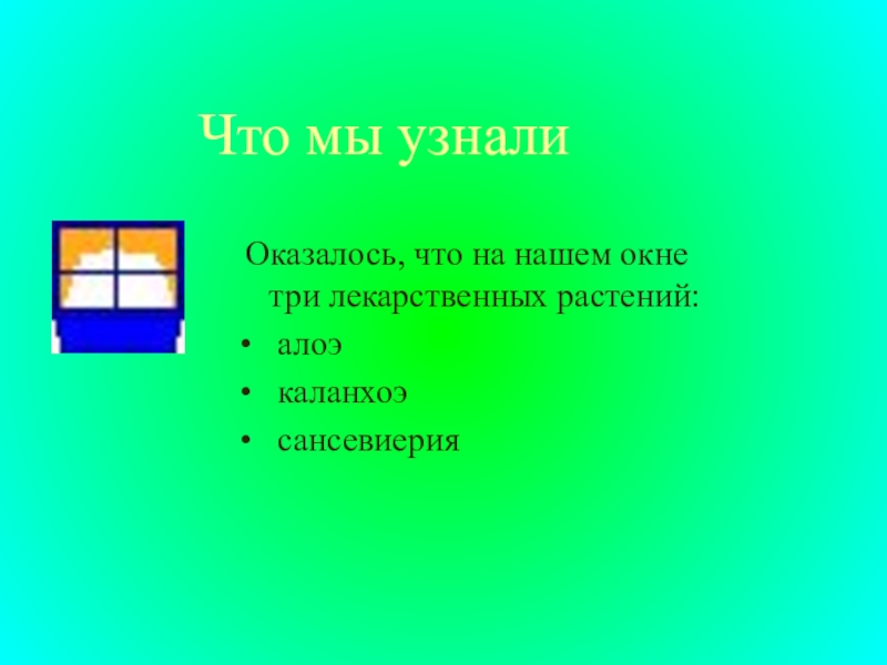 Что мы узнали Оказалось, что на нашем окне три лекарственных растений: алоэ каланхоэ сансевиерия