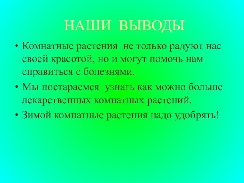 НАШИ ВЫВОДЫКомнатные растения не только радуют нас своей красотой, но и могут помочь нам
