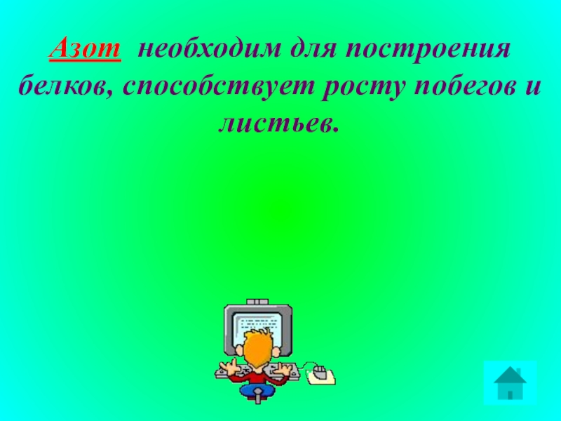 Слайд 13Азот необходим для построения белков, способствует росту побегов и листьев.