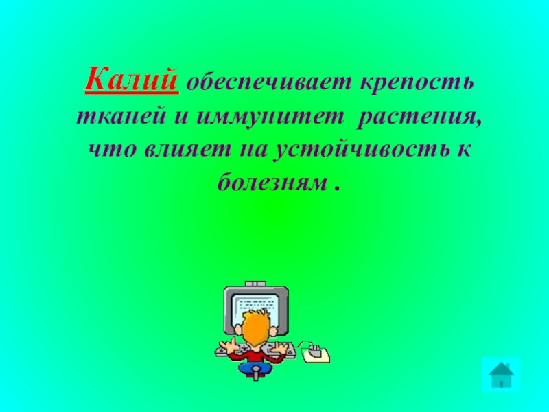 Слайд 15Калий обеспечивает крепость тканей и иммунитет растения, что влияет на устойчивость