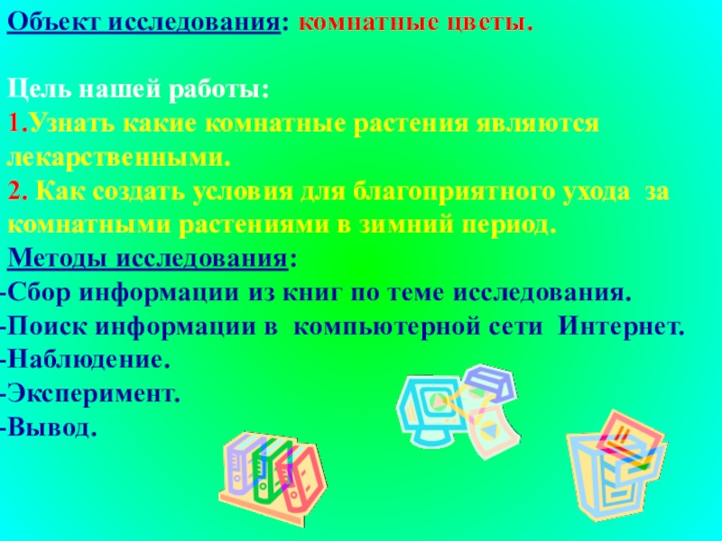 Объект исследования: комнатные цветы.Цель нашей работы:1.Узнать какие комнатные растения являются лекарственными.2. Как создать условия для благоприятного ухода за комнатными растениями в зимний период. Методы исследования:Сбор информации из книг по теме исследования.Поиск информации в компьютерной сети Интернет.Наблюдение.Эксперимент.Вывод.
