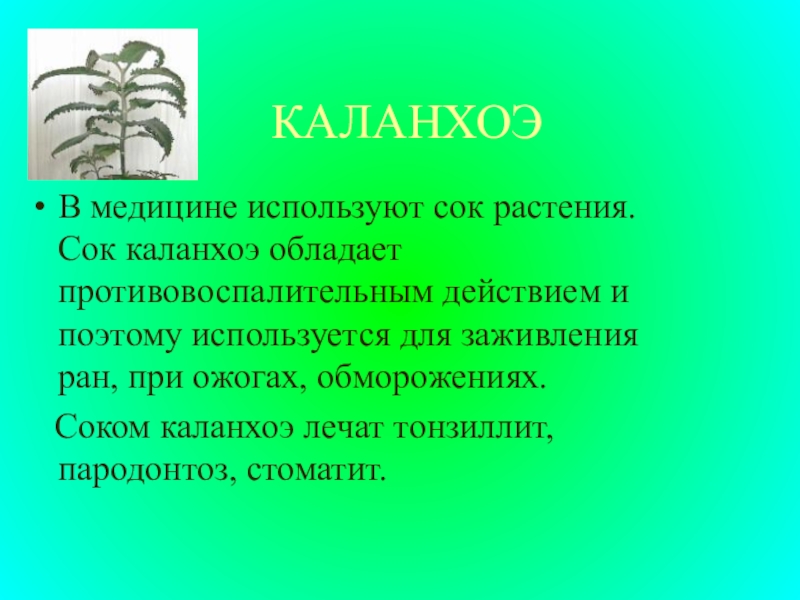 КАЛАНХОЭВ медицине используют сок растения. Сок каланхоэ обладает противовоспалительным действием и поэтому