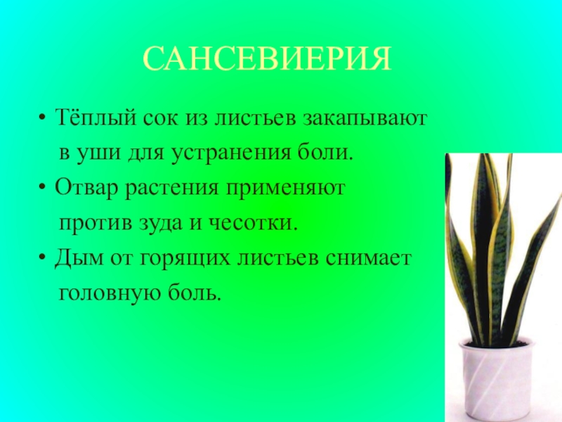 САНСЕВИЕРИЯТёплый сок из листьев закапывают   в уши для устранения боли.Отвар растения применяют   против