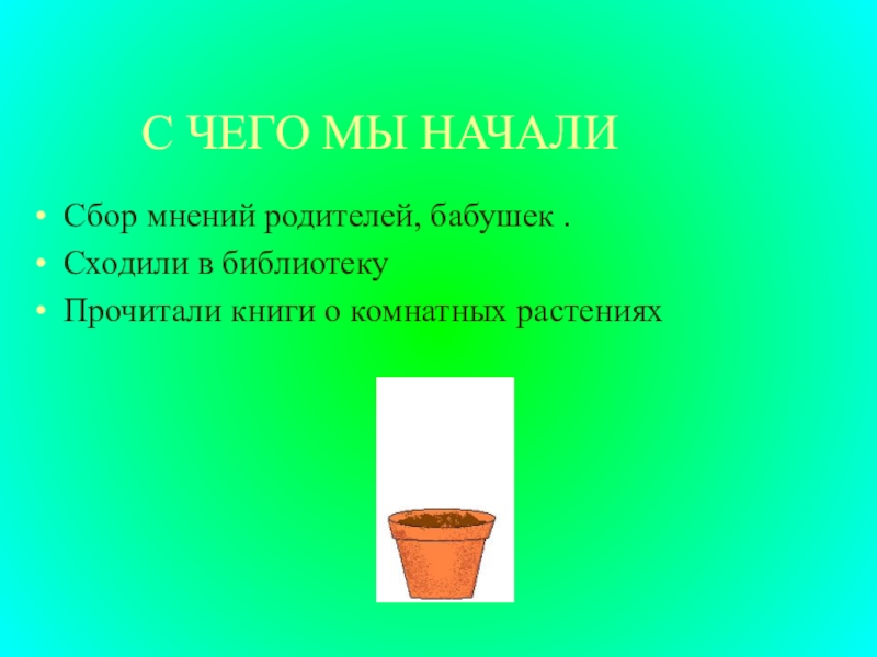 С ЧЕГО МЫ НАЧАЛИСбор мнений родителей, бабушек .Сходили в библиотекуПрочитали книги о комнатных растениях