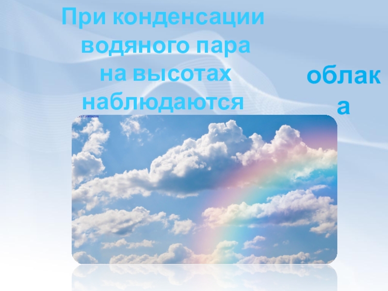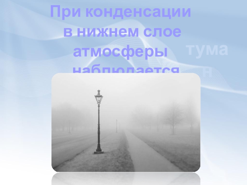 При конденсации в нижнем слое атмосферы  наблюдаетсятуман