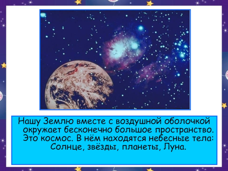 космос. В нём находятся небесные тела: Солнце, звёзды, планеты, Луна.