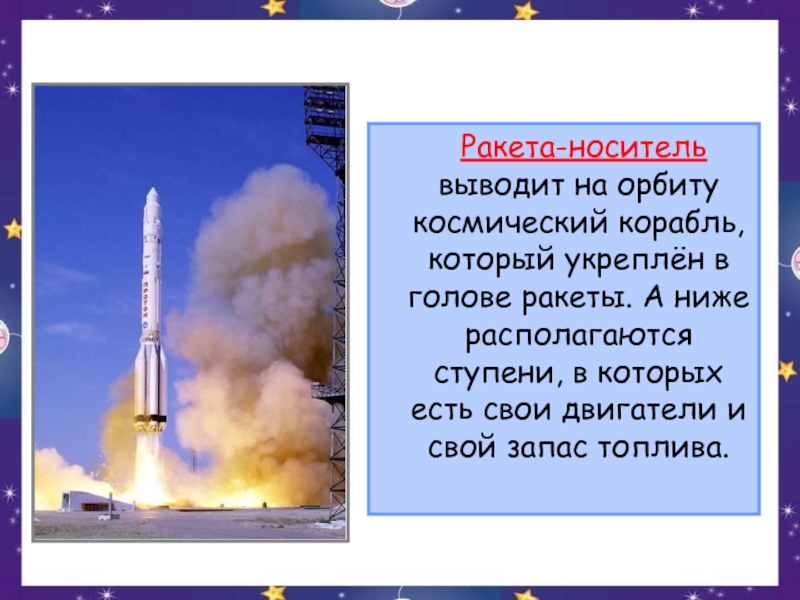 Ракета-носитель выводит на орбиту космический корабль, который укреплён в голове ракеты.