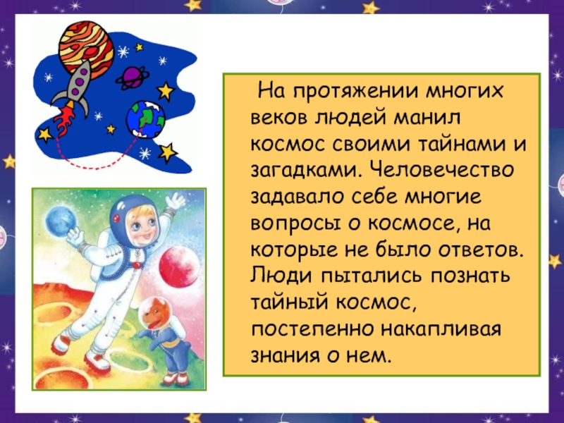 Человечество задавало себе многие вопросы о космосе, на которые не было ответов. Люди пытались познать тайный космос, постепенно накапливая знания о нем.