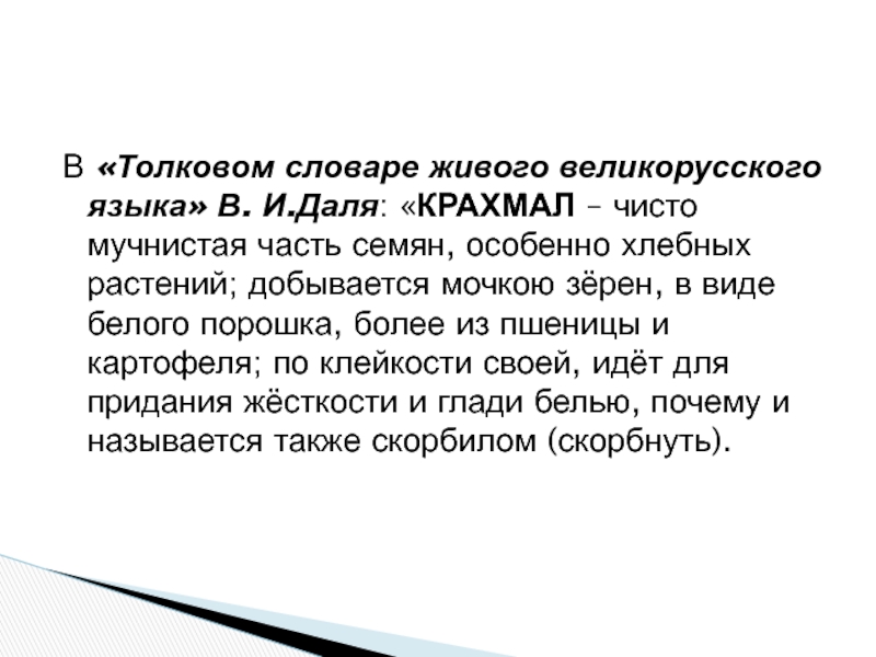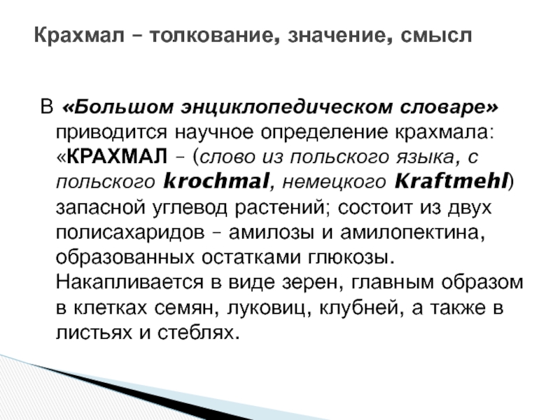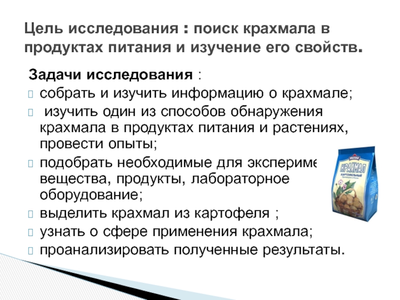 Цель исследования : поиск крахмала в продуктах питания и изучение его свойств.
