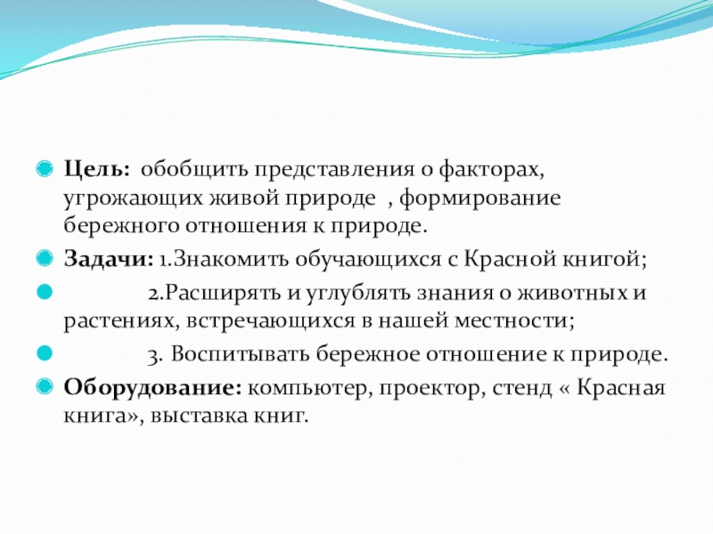Цель: обобщить представления о факторах, угрожающих живой природе , формирование бережного