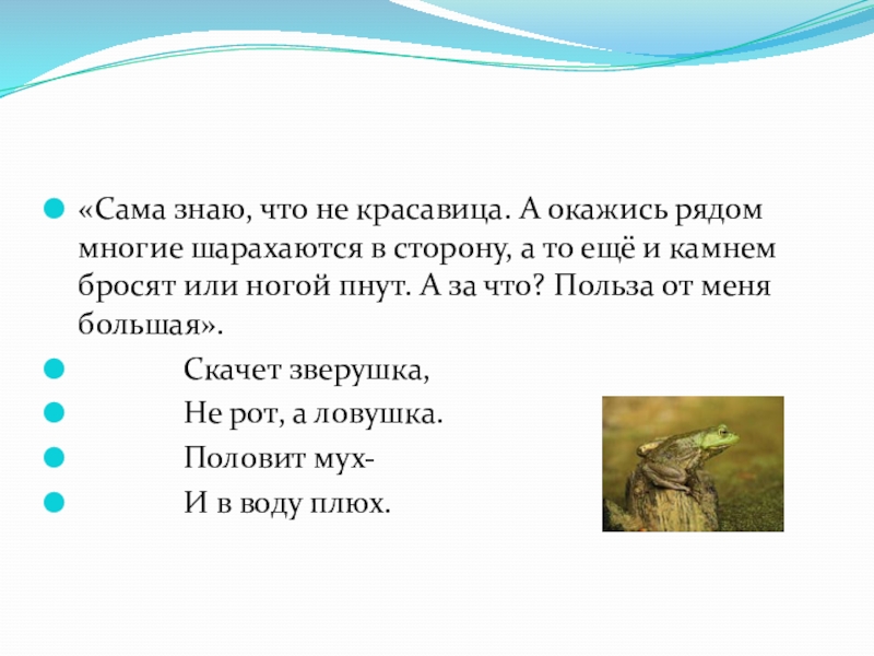 Слайд 8«Сама знаю, что не красавица. А окажись рядом многие шарахаются в