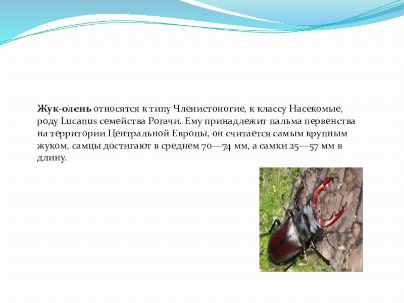 Слайд 10Жук-олень относятся к типу Членистоногие, к классу Насекомые, роду Lucanus семейства