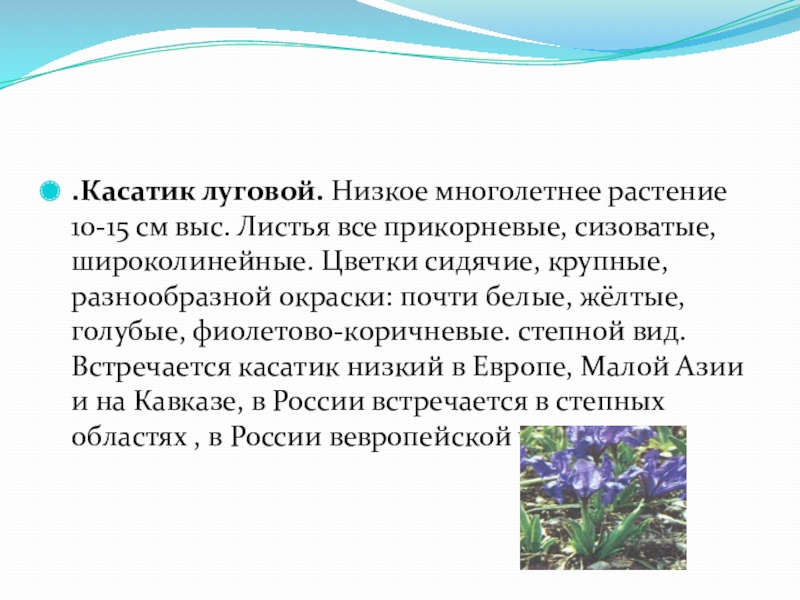 Слайд 12.Касатик луговой. Низкое многолетнее растение 10-15 см выс. Листья все прикорневые,