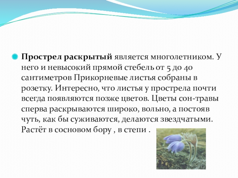Слайд 13Прострел раскрытый является многолетником. У него и невысокий прямой стебель от
