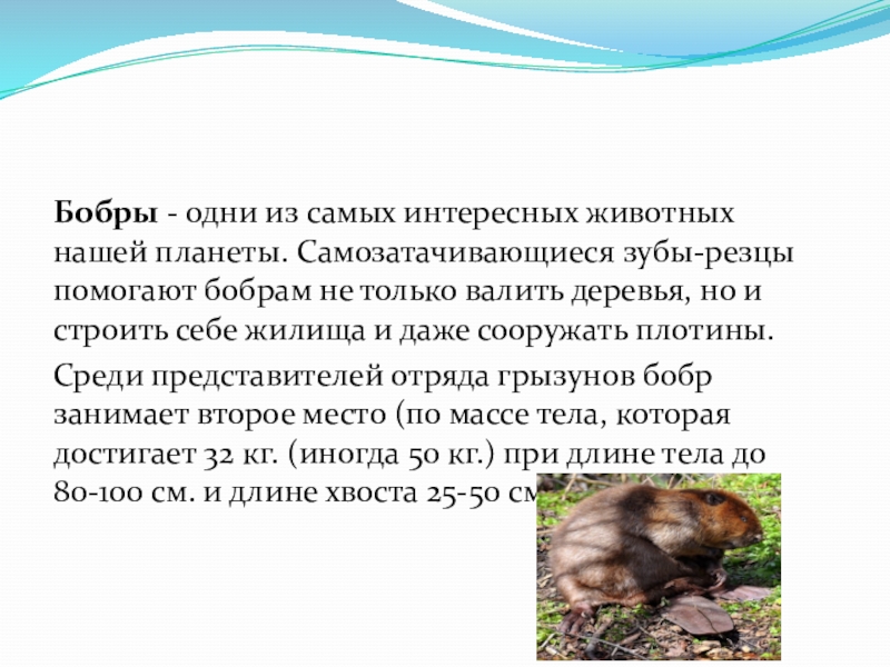 Слайд 11Бобры - одни из самых интересных животных нашей планеты. Самозатачивающиеся зубы-резцы