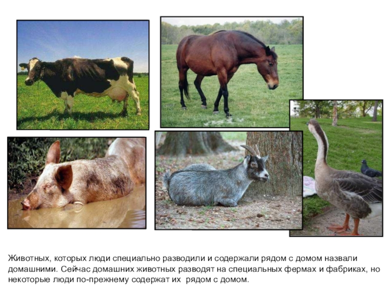 Животных, которых люди специально разводили и содержали рядом с домом назвали домашними. Сейчас домашних животных разводят на специальных фермах и фабриках, но некоторые люди по-прежнему содержат их рядом с домом.