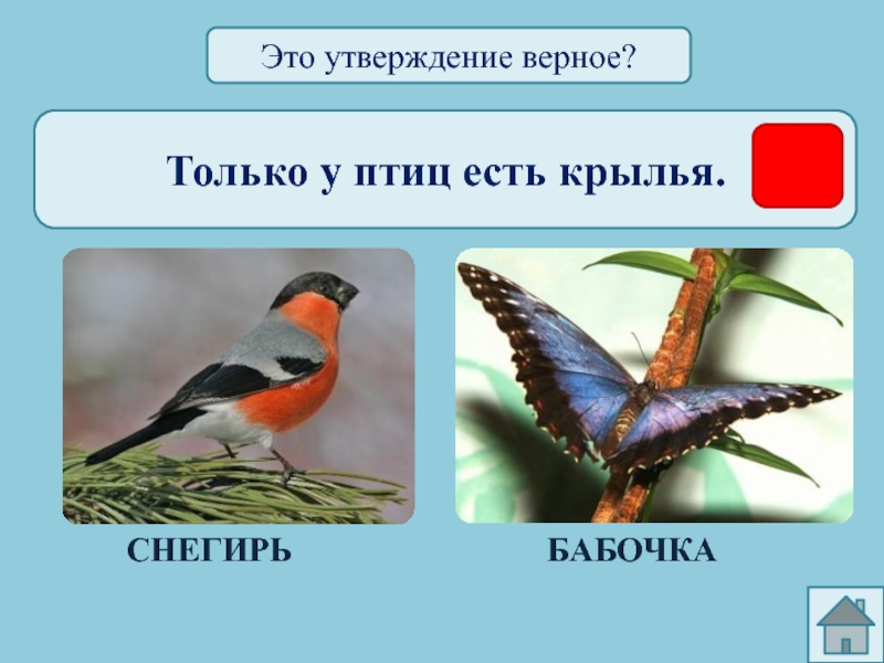 Только у птиц есть крылья.СНЕГИРЬБАБОЧКАЭто утверждение верное?