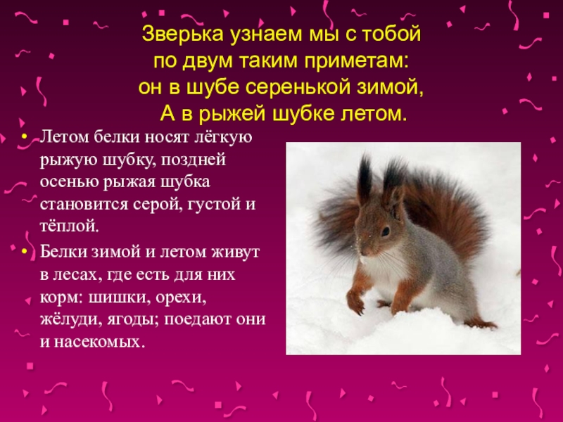 Летом белки носят лёгкую рыжую шубку, поздней осенью рыжая шубка становится серой, густой и тёплой.