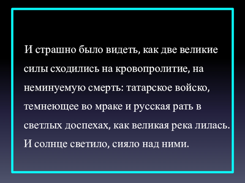 сходились на кровопролитие, на неминуемую смерть: татарское войско, темнеющее во мраке и русская рать в светлых доспехах, как великая река лилась. И солнце светило, сияло над ними.