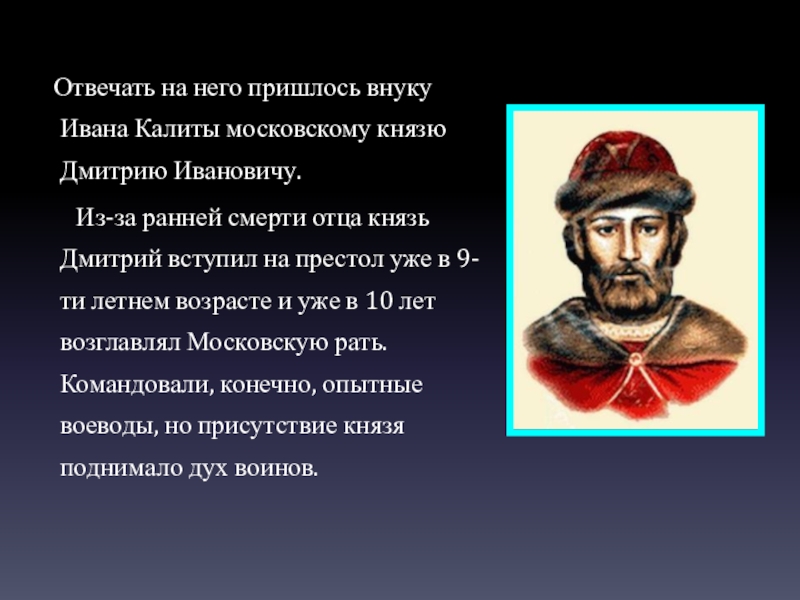 Из-за ранней смерти отца князь Дмитрий вступил на престол уже в 9-ти летнем возрасте и уже в 10 лет возглавлял Московскую рать. Командовали, конечно, опытные воеводы, но присутствие князя поднимало дух воинов.