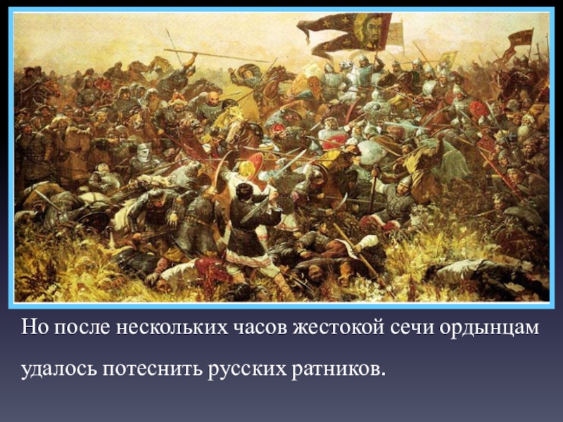 Слайд 25Но после нескольких часов жестокой сечи ордынцам удалось потеснить русских ратников.