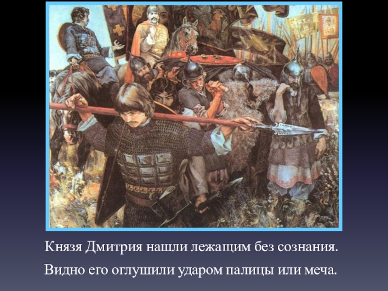Слайд 29 Князя Дмитрия нашли лежащим без сознания. Видно его