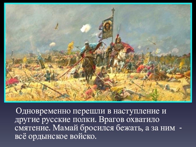 Врагов охватило смятение. Мамай бросился бежать, а за ним - всё ордынское войско.