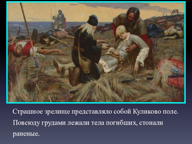 Слайд 28 Страшное зрелище представляло собой Куликово поле. Повсюду грудами лежали