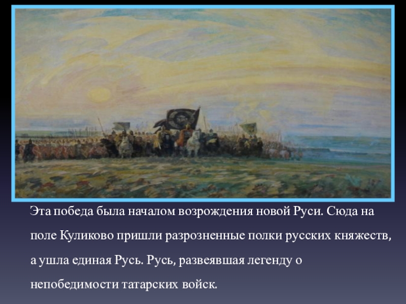 на поле Куликово пришли разрозненные полки русских княжеств, а ушла единая Русь. Русь, развеявшая легенду о непобедимости татарских войск.