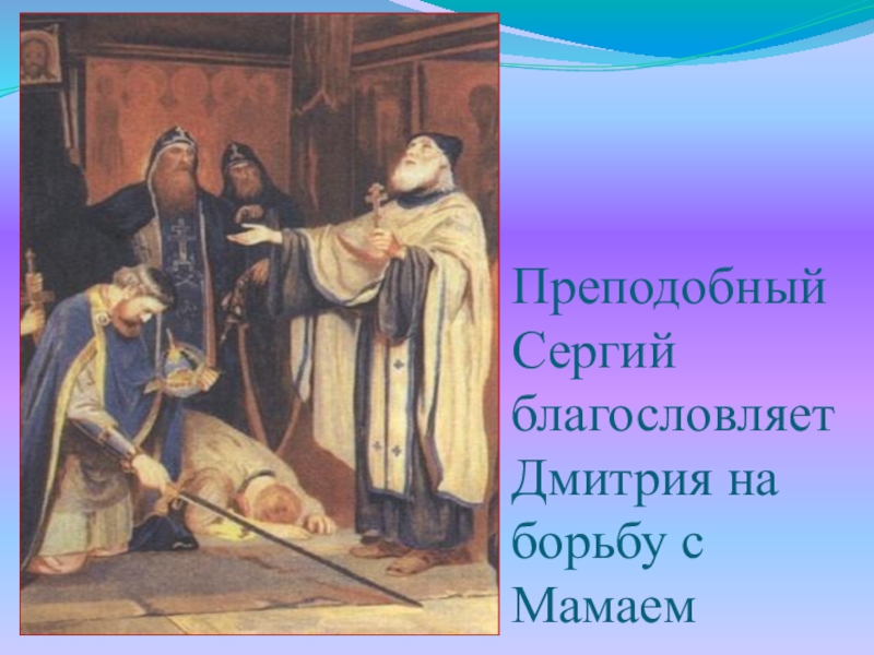 Слайд 6Преподобный Сергий благословляет Дмитрия на борьбу с Мамаем