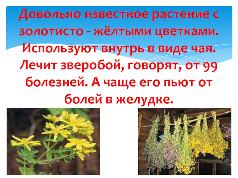 виде чая. Лечит зверобой, говорят, от 99 болезней. А чаще его пьют от болей в желудке.