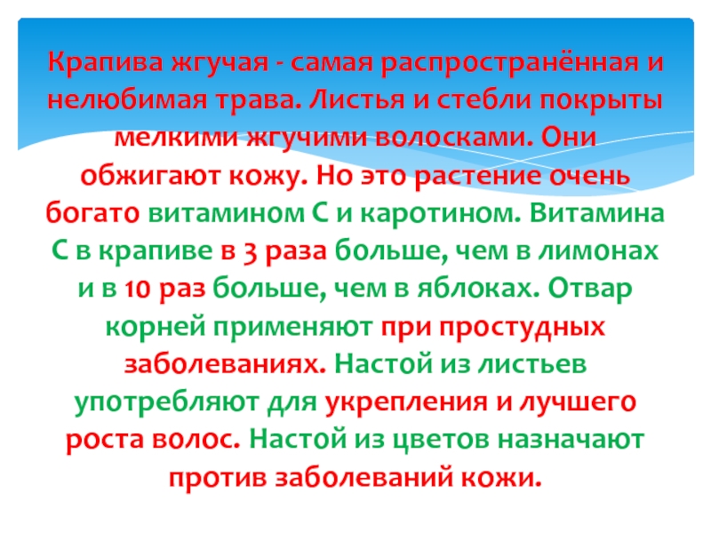 покрыты мелкими жгучими волосками. Они обжигают кожу. Но это растение очень богато витамином С и каротином. Витамина С в крапиве в 3 раза больше, чем в лимонах и в 10 раз больше, чем в яблоках. Отвар корней применяют при простудных заболеваниях. Настой из листьев употребляют для укрепления и лучшего роста волос. Настой из цветов назначают против заболеваний кожи.